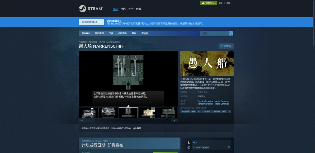 Steam平台需要先安装Steam平台,之后注册一个账号登录,然后搜索“愚人船 NARRENSCHIFF”进入商店购买页面。
